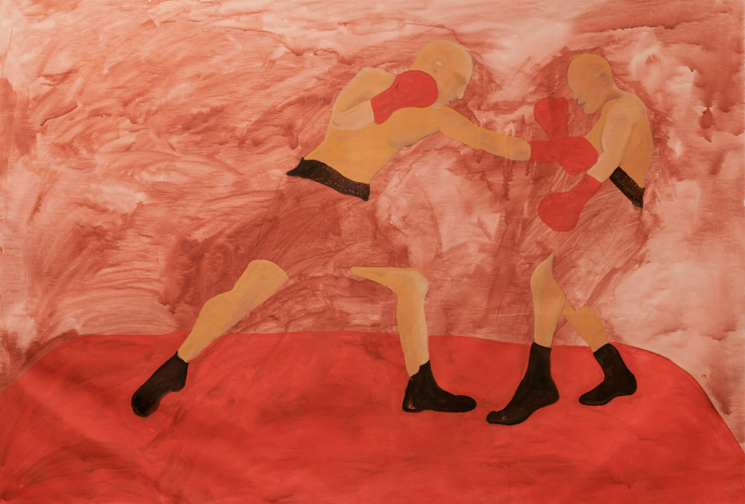 In Between Survival and Surrender, two boxers are locked in combat, one frozen midstrike in what could be the decisive blow. The figures are nearly identical, prompting the viewer to ask: are they two opponents, or two halves of the same self?