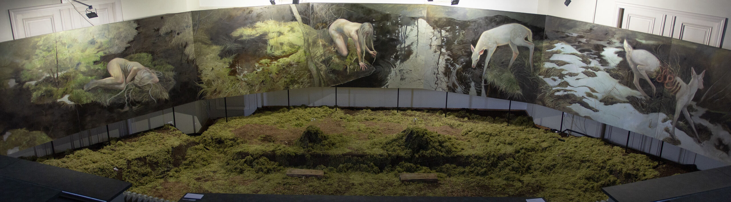 This interdisciplinary composition serves as a meditation on the fear of death. The mythological forest depicted in the painting establishes a sense of a location suspended between life and death, in space and time. Accompanying scents and sounds enhance the atmosphere, evoking associations with nature that feel slightly off, resulting in an uncanny mood. Viewers are invited to immerse themselves in this environment and explore their feelings regarding mortality.