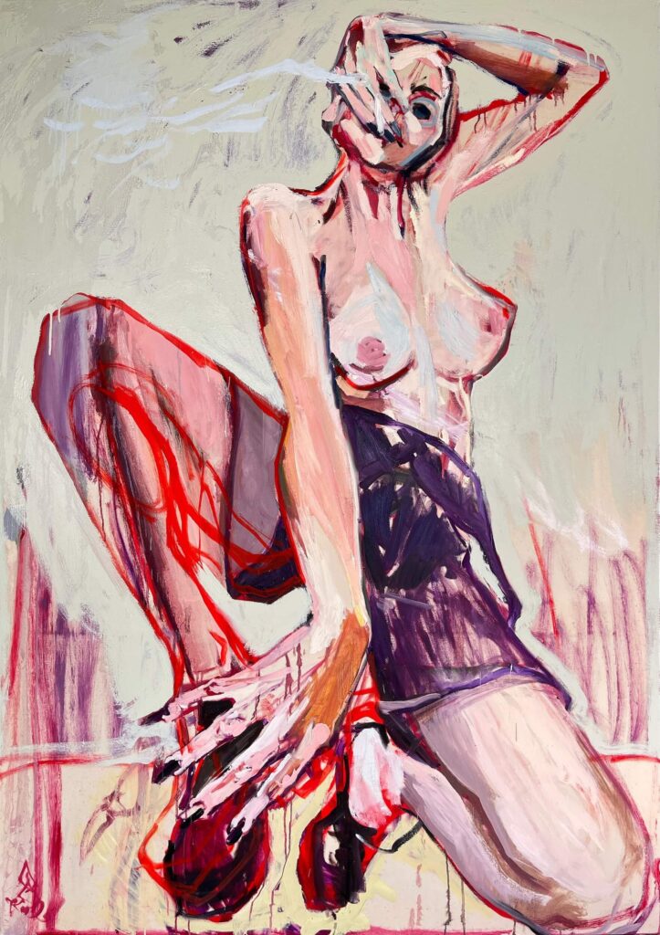 The artwork “Left hand doesn’t know what the right is doing” is both a mixture between the two phrases, an ironic nod and a literal statement. The artwork is a reflection of an incongruous relationship between the three key human elements – the mind, the body and the soul. A rift in this sacred relationship can be caused by many things and can present itself in a plethora of negative outcomes. In this case, it is presented as obsessively and intuitively picking at one’s hangnails. It is a symptom of a much deeper rift, that cosmetically is often viewed as repulsive or something to be ashamed of. The paintings serve as a way to rid oneself of the stigma and bodily result of anxiety and obsessive compulsions, simultaneously bringing awareness to a surprisingly common affliction.