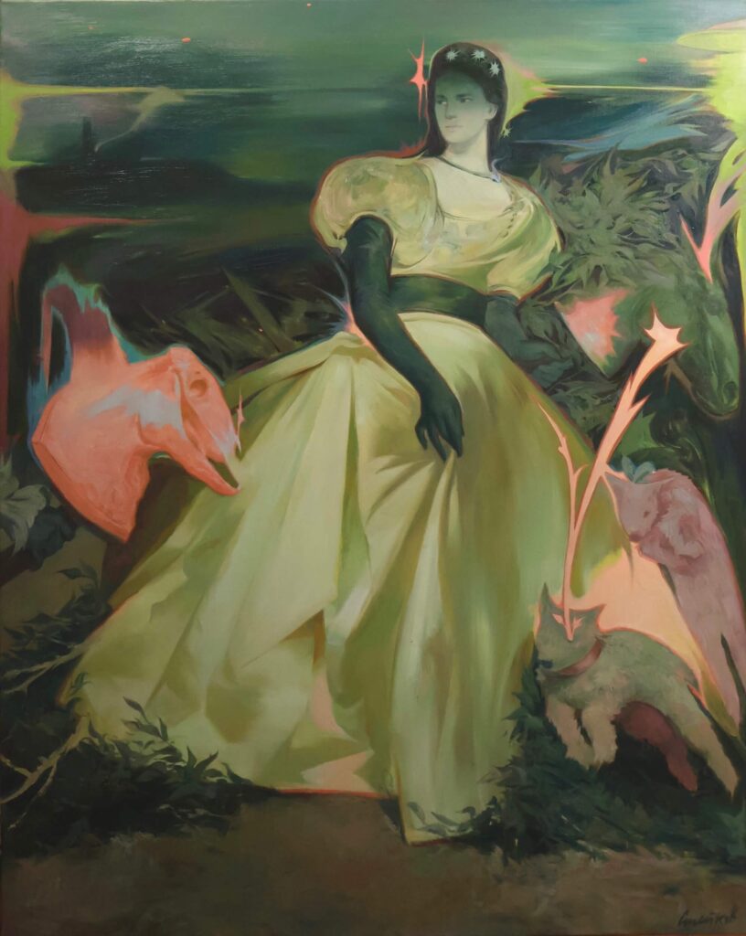 This layering recalls the process of transillumination used in painting restoration, where ultraviolet light reveals what lies hidden beneath the surface – dead layers glowing in fluorescent reds, greens, and blues. Here, too, light acts as revelation, exposing the strata of images, histories, and half-forgotten myths embedded in the painted field.