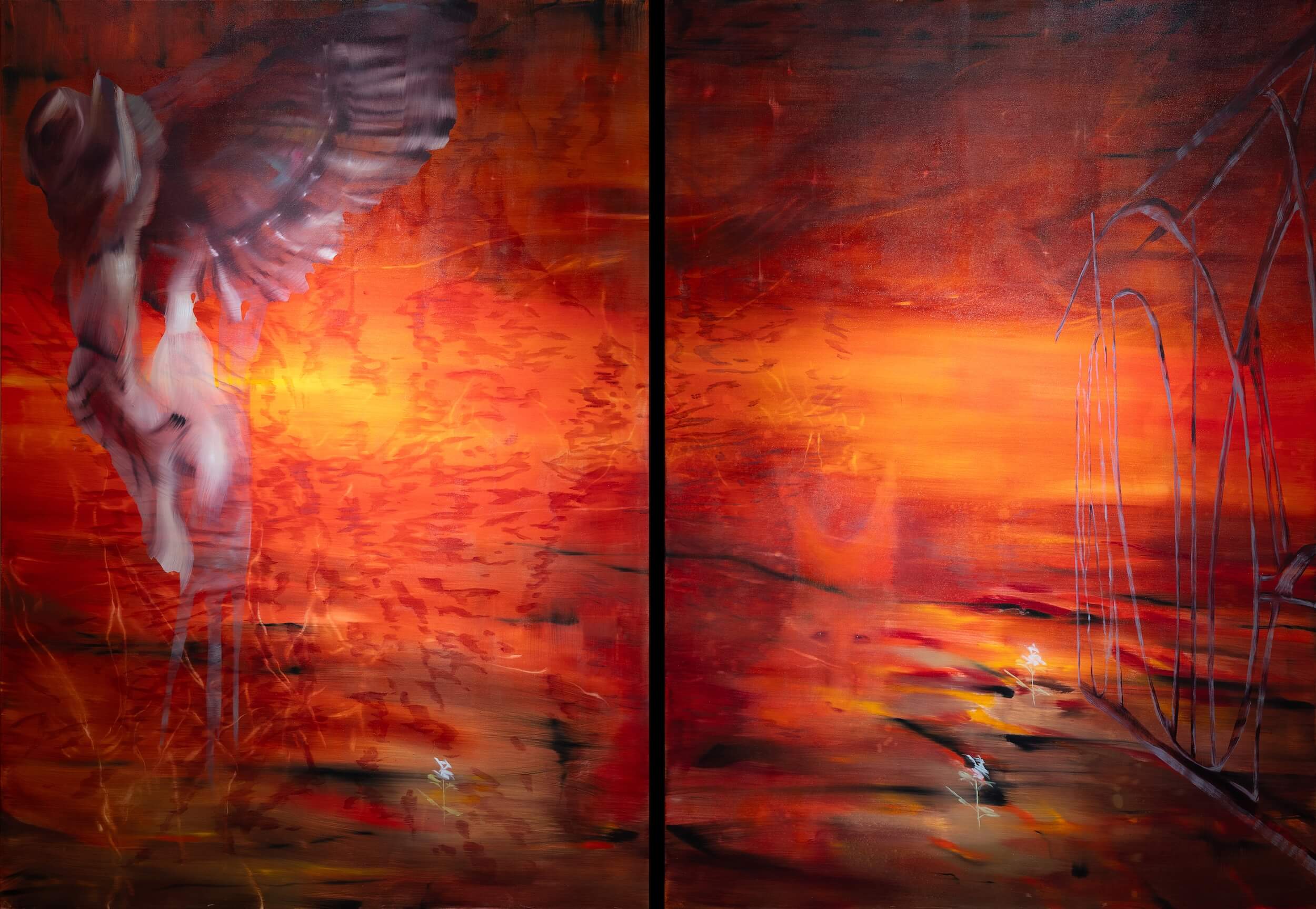 The diptych unfolds in this atmosphere – like sunset and inferno at once – embodying a mood of apocalyptic anxiety. The surface is saturated with crimson tones and layered contexts: a spectral angel-flower remade from the enigmatic Voynich manuscript. This mysterious pre-Renaissance codex, discovered in 1912 by the Polish-Lithuanian antiquarian Wilfrid Voynich, is filled with illustrations of unearthly plants. Alongside it appears the fragile wire fence borrowed from the aforementioned video game The Void, and the faint apparition of an AI-generated wolf, flickering between vision and machine dream.